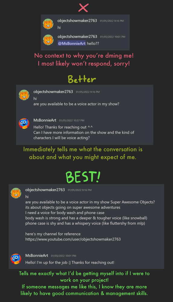 Do not wait for me to accept your friend request before sending a message! I am more likely to accept a friend request after I know what you want from me.•Don’t take it harshly if I don’t accept to work for you! Many people ask me to join their shows and I need to be selective. For my own sanity.•AI: I do not want my voice to be replicated with AI. Please do not make AI models of characters I voice.Regarding MY OCs• Fanart: I LOVE FANART of my characters!!!